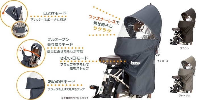 ファスナーレスを実現し、子どもの乗せ降ろしをラクに オールシーズン活躍の自転車チャイルドシート用レインカバー新発売