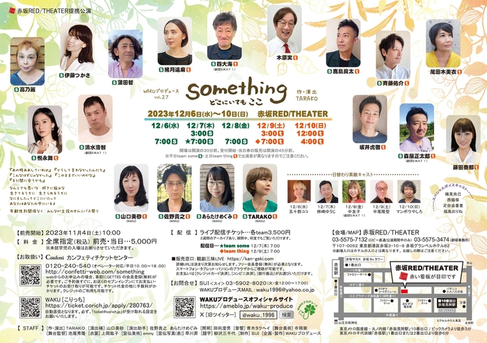 WAKUプロデュース主催、『something どこにいても ここ』が2023年12月6日 (水) ~2023年12月10日 (日)に赤坂レッドシアター(東京都港区赤坂3-10-9赤坂グランベルホテルB2F)にて上演されます。