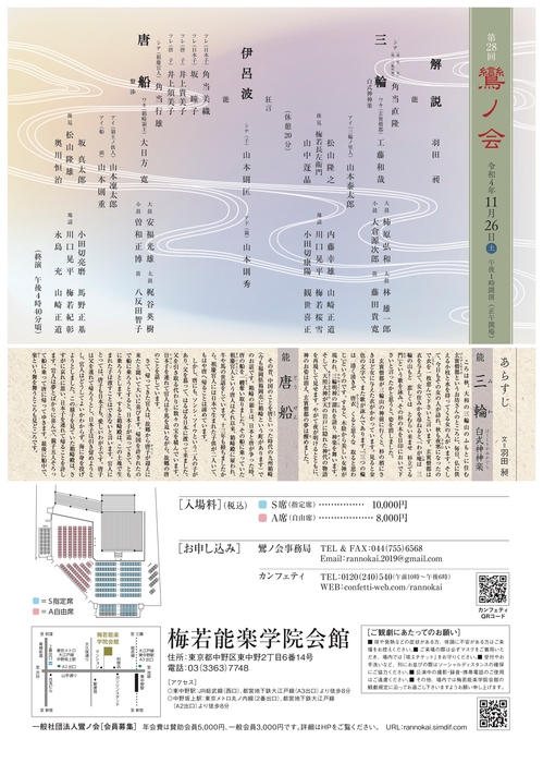一般社団法人鸞ノ会主催『第28回鸞ノ会』が2022年11月26日 (土)に梅若能楽学院会館(東京都中野区東中野2-6-14)にて開催されます。