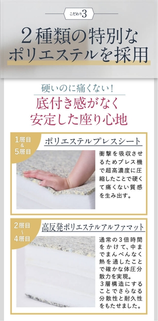2種類の高反発ポリエステルで、硬いのに痛くない、底付き感無しの座り心地を叶えました。