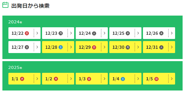 行けるタイミングのどこの方面が空いているのか、安いのかなど、出発日から検索できる出発日検索を用意しました。出発日別にさくっと検索!さらに絞り込みで予算を設定すれば予算に合うツアー情報をお選びいただけます!