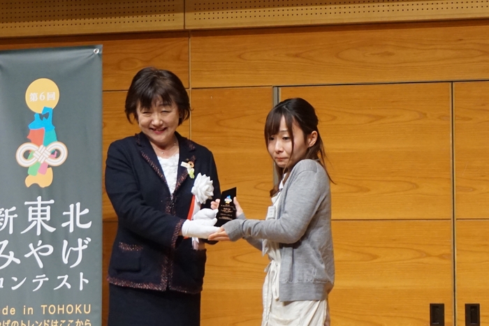 受賞者代表スピーチでは、開発を主導した同社・日野朱夏さんより「石巻のもので宮城・石巻を元気にしていきたいという思いで開発してきた。kitaha発売当初から宮城のお土産物にしたいという思いがあったので、新東北みやげコンテストで最優秀賞をいただけたことは大変うれしい」と商品にかけた思いをお話しいただきました。