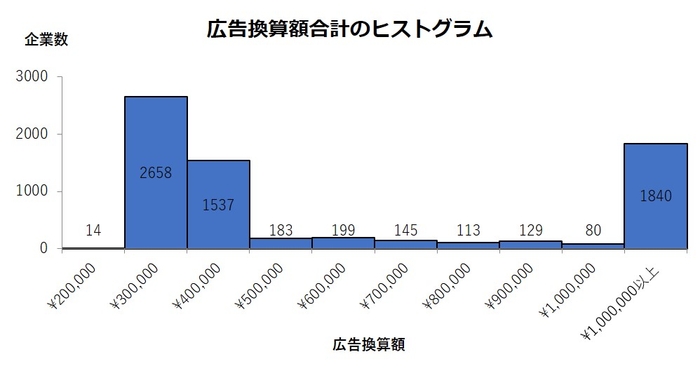 続いて広告換算額の分布図を見てみると、中央値は「300,000円」でした。この金額であれば結果として概ね「良かった」と言えます。