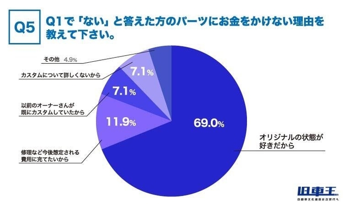 「こだわってお金をかけたパーツがない」と答えた方の理由について聞いてみると、最も多かった回答は「オリジナルの状態が好きだから」で69.0%でした。