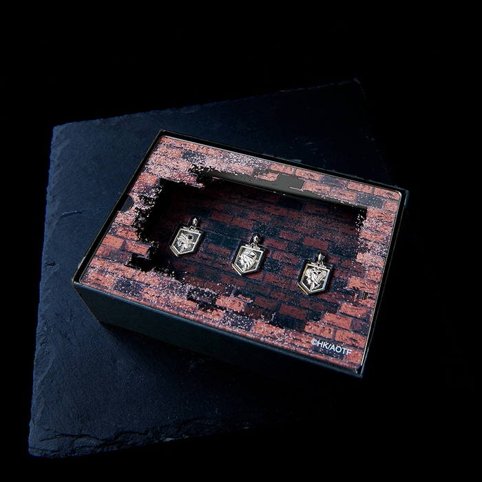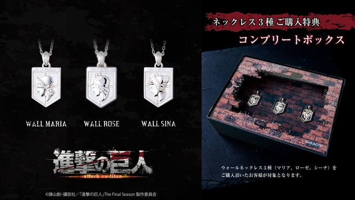 TVアニメ「進撃の巨人」に登場するウォール・マリア、ウォール・ローゼ、ウォール・シーナを再現したシルバーネックレスの全種コンプリートBOX付きセットです。