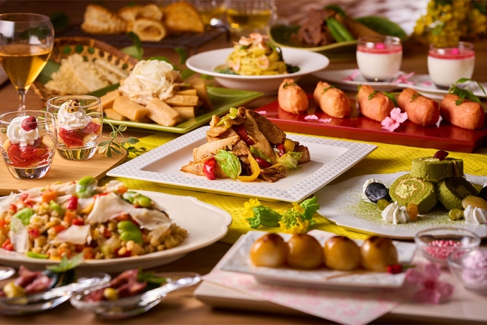 この時期ならではの、春らしい彩り豊かなメニューが並びます。桜えびの旨みと菜の花のほろ苦い風味、バジルが香る濃厚なクリームソースの相性が抜群の「桜えびと菜の花のクリームパスタバジル風味」や、カラフルな見た目とプチプチ食感が楽しい「ツナと小麦の菜園風サラダ」など、目でも舌でも楽しめるメニューが揃います。「春野菜の回鍋肉」は食欲をそそる一品。「桜のクレーマコッタ」や「いちごのトライフル仕立て」など、写真映えするスイーツもおすすめです。
