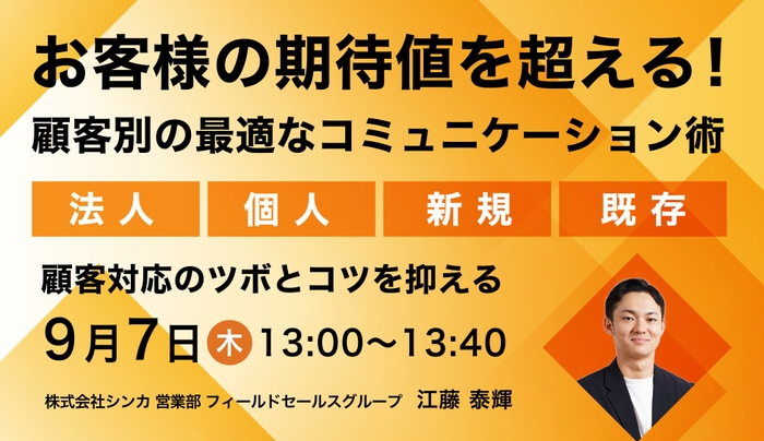 コミュニケーションプラットフォーム「カイクラ」の開発・販売を行う株式会社シンカ(本社:東京都千代田区、代表取締役社⻑ 江尻高宏、以下、「シンカ」)は、無料オンラインセミナー「お客様の期待値を超える!顧客別の最適なコミュニケーション術〜法人/個人/新規/既存/ 顧客対応のツボとコツを抑える〜」を2023年9月7日(木)に開催いたします。