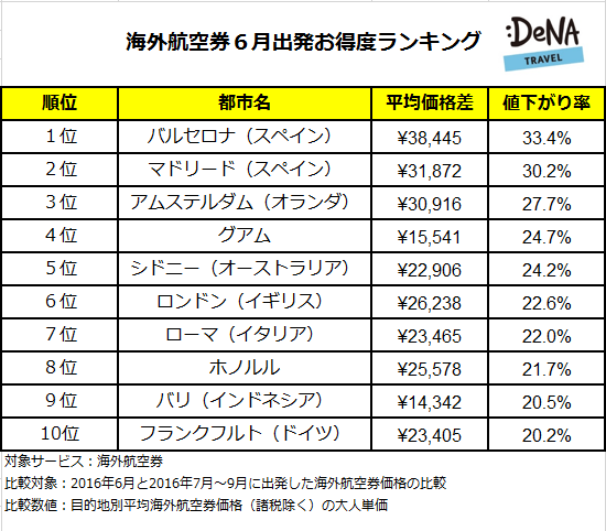オンライン総合旅行サービス「DeNAトラベル」(http://www.skygate.co.jp)を運営する株式会社DeNAトラベル(本社:東京都新宿区、代表取締役社長:中野正治)は、2016年6月と同年の夏休み期間(7月から9月)に出発の海外航空券平均価格を比較し、6月の値下がり率が大きい順にランキング化しました。