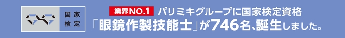 2022年4月より、国の定める「技能検定」の職種に「眼鏡作製職種」が新設され、国家資格「眼鏡作製技能士」がスタートし、パリミキでは現在までに、業界NO.1の746名が眼鏡作製技能士の資格を取得しました。多様化・高度化するお客様のニーズにあわせて、「適切な診断・治療」と「適切な眼鏡作製」の双方の実現に向け、眼鏡技術者が眼科専門医と連携しつつ、皆様により良い眼鏡を提供し、目の健康を守れるよう、眼鏡作製の技能を高めてまいります。