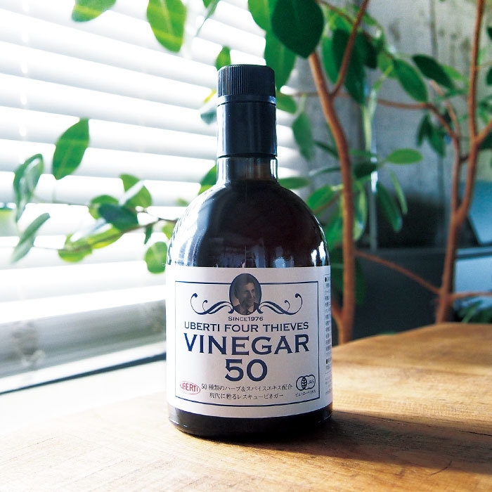 このビネガーの歴史は興味深い伝説から始まります。1928年、フランスで黒死病の大流行により病死する人が続出。そんななか、何があっても体調を崩すことなく、空き家になった家々で盗みをはたらいていた4人の泥棒がいました。逮捕された後、重罰を逃れることを条件に、彼らが健康管理のために用いていた秘策を明かします。それが、ハーブなどの薬効植物を漬け込んだお酢。彼らはその秘伝レシピすら盗んでいたのです。このレシピはたちまち全土に広まり、1748年にはフランスの薬局に正式に登録されました。その後何世紀にもわたり、このビネガーの優秀さが実証され続けています。