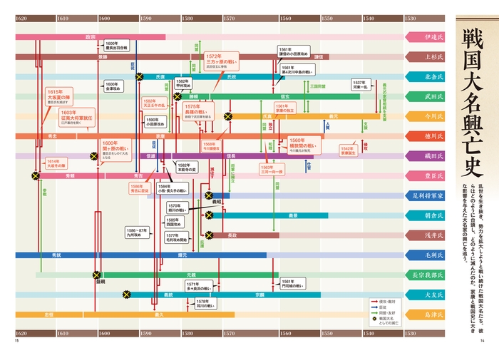 本書の特徴のひとつが、豪華ワイド折込が3点、計6面付いている点です。内容は以下の通りです。①人物相関図、②勢力変遷マップ、③超精密!パノラマ再現イラスト「関ヶ原合戦」、④同「大坂冬の陣」、⑤江戸図屏風、⑥徳川十六将図。
