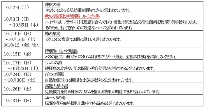 10月は秋の特別湯として期間限定「ルイボス湯」をご用意いたしました。その他にも、効能いろいろな薬草風呂をご用意しております。日頃の疲れを癒す、薬草風呂で至福のひとときをお過ごしください。