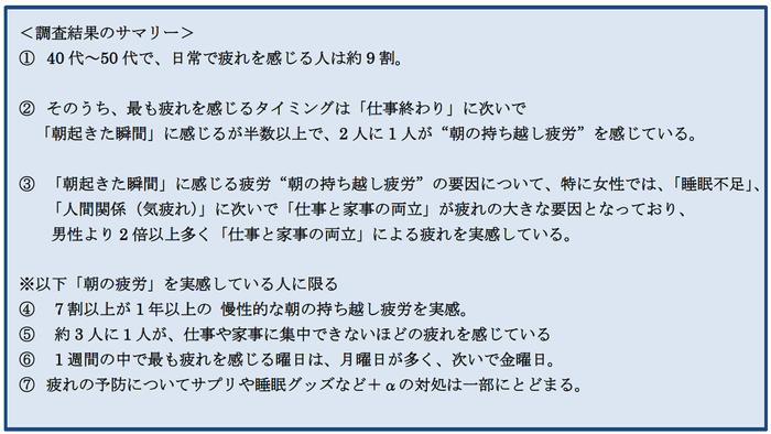 本調査の結果、40代~50代の9割以上の人々が日常生活で疲労を感じていることが分かりました。また、疲れを感じる方の2人に1人が“朝の持ち越し疲労”を実感していることが判明しました。