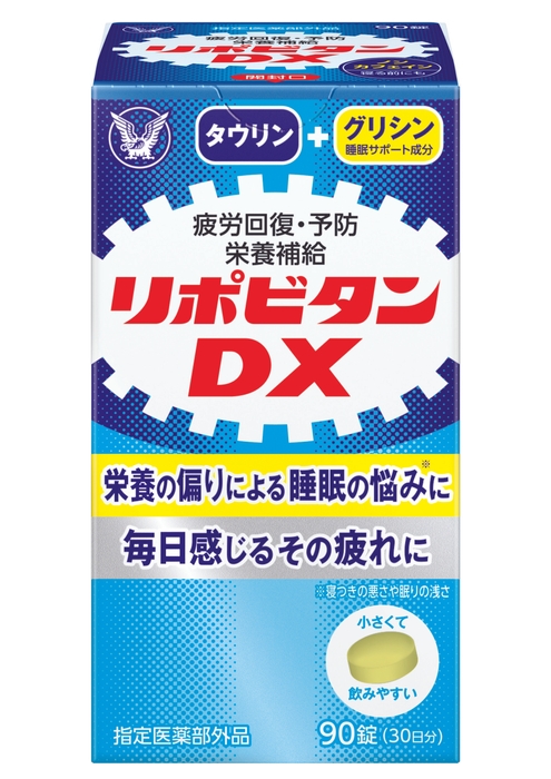 「リポビタンDX」は、「リポビタン(錠剤)」として発売されたブランド第一号製品以来の、約40年ぶりに登場した錠剤タイプの疲労回復を目的としたビタミン剤です。15才以上1日1回3錠の服用で、エナジーサイクルに働きかけるタウリン500mgやビタミンB1,B2,B6が摂取でき、またグリシンとシゴカの睡眠サポート成分を配合しているため、日々の生活で疲れを感じる方やしっかり寝たのに疲れが残る方におすすめの製品です。ノンカフェインで、おやすみ前の服用も考えて開発しております。