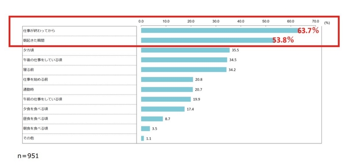 「仕事終わり」に次いで、「朝起きた瞬間」に疲労実感する人が多く半数以上という結果に。