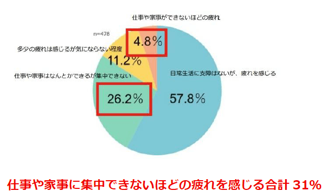 朝の疲れを感じている方の約3人に1人が仕事や家事に集中できないほどの疲れを感じている。