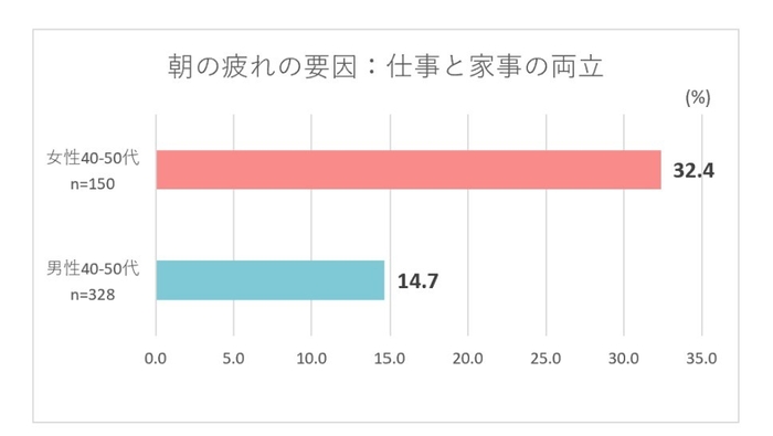 特に女性では、睡眠不足、人間関係に次いで「仕事と家事の両立」が疲れの大きな要因となっており、男性より2倍以上多く「仕事と家事の両立」による疲れを実感している。