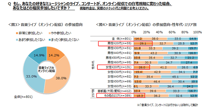 仮に好きなミュージシャンのライブ、コンサートが、オンライン配信での自宅視聴に変わったとして、その参加意向を聞いたところ、「非常に鑑賞したい」は、14%となり、「やや鑑賞したい」を含めた「鑑賞したい」層は52%となった。前述の映画鑑賞と同様に、「鑑賞したくない」層と約半々に分かれた<図3>。