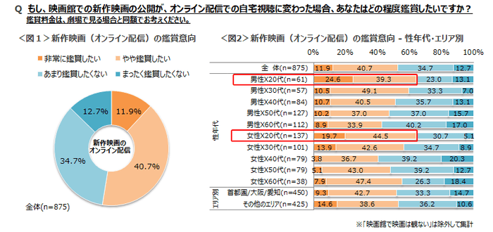 【新作映画のオンライン配信での鑑賞意向】は、賛否両論分かれたが、比較的20代は肯定的。