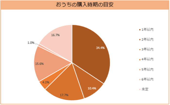 『おうち購入時期の目安』については、1年以内に購入を検討されている方が 34.4%と多いですが、今すぐに購入を考えていない方もおうちの見学を実施しているという結果となりました。