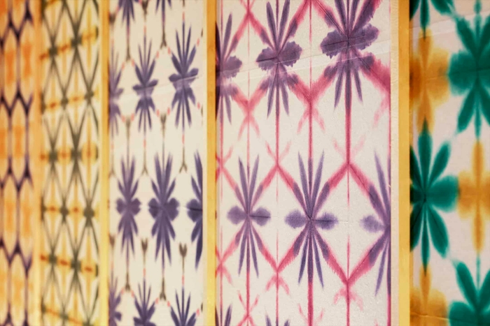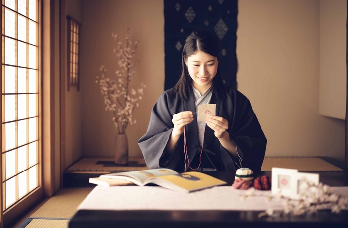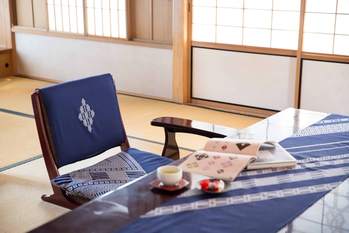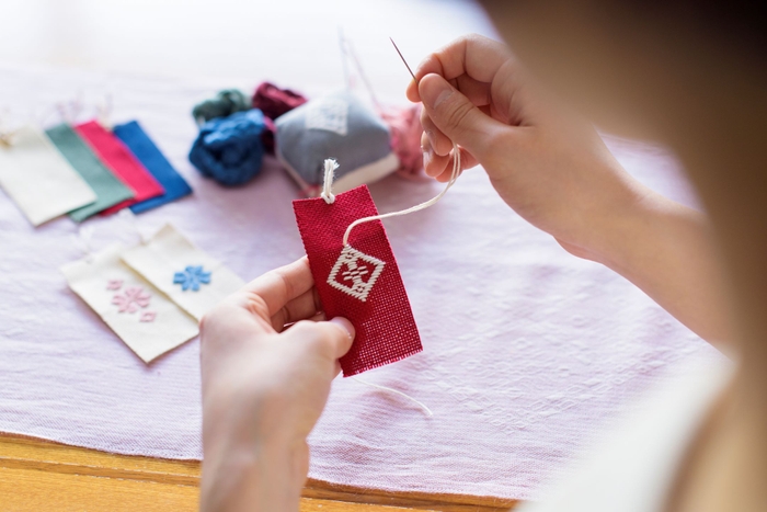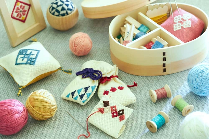 美しいシンメトリーな模様がモダンにアレンジできると人気の青森の伝統工芸「津軽こぎん刺し」。界 津軽では、滞在中に好きなだけ刺繍体験ができる貸出キットを用意します。