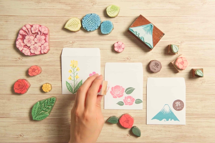 地元静岡在住の消しゴムはんこ作家、津久井智子氏監修の「消しゴムはんこ作り」セットを用意します。彫刻刀を使って、はんこを作ります。津久井氏作成の「花はんこ」もお手本に貸し出します。