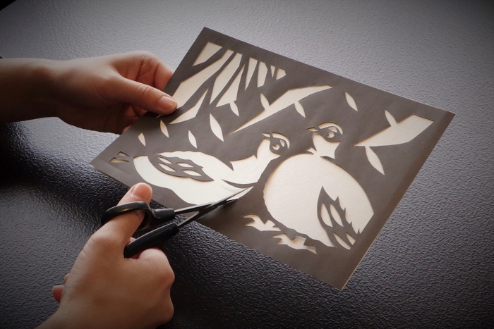信州の切り絵作家、柳沢京子さんのデザインの下絵を、切り絵用のはさみで切りぬく体験ができるセットを用意します。切った後は色鉛筆で色をつけ、額に入れて持ち帰ることができます。