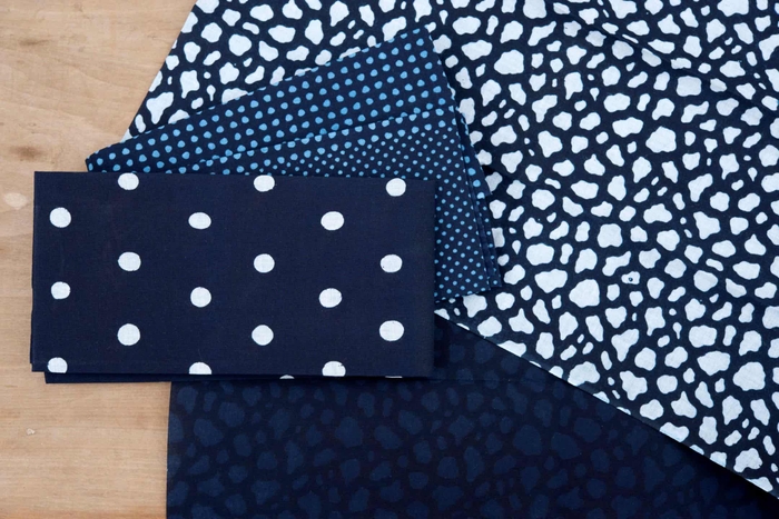 栃木県の民藝品「黒羽藍染」でがまぐちポーチを作るキットを用意します。伝統技法による手染めの布は、どれも味わい深い藍色。好きな柄を選ぶのも楽しみの一つです。