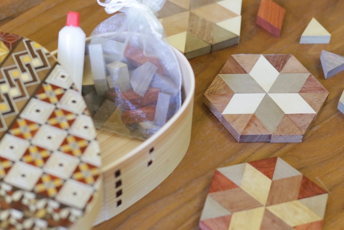 標高の高低差がある箱根の山は、多種多様な木材がとれ、木の色味や木目を活かした寄木細工が盛んな地。界 箱根では、客室で天然の木の色をつないで世界にひとつだけのコースターを作れます。