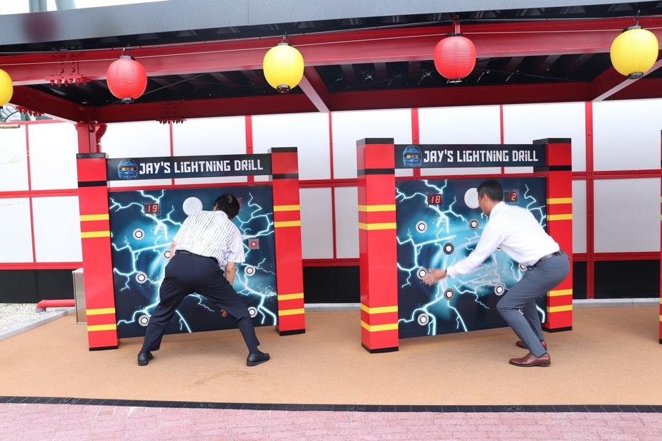 河村市長は「レゴニンジャゴー・ワールド」を訪れ、目玉アトラクションである「フライング・ニンジャゴー」の視察※写真1を始め、プレイゾーンエリアにて、ニンジャに必要な反射神経や集中力を鍛える「ジェイ・ライトニング・ドリル」の体験※写真2、またレゴニンジャゴーキャラクターとのグリーティング※写真3など、新エリア内を視察訪問いたしました。