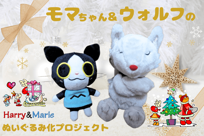 今回のクラウドファンディングでは、ファンから選ばれた人気キャラクター、森の賢者ウォルフと気まぐれハチワレ猫のモマちゃんのぬいぐるみを制作中です。