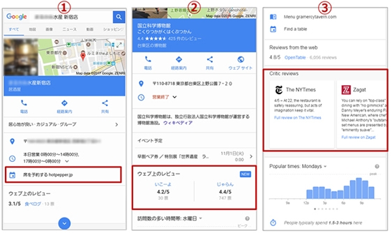 Google はGoogle マイビジネスや構造化データなどを利用してローカルビジネス情報を収集しています。2016年はマイビジネスのデータ入力と認証方法の改善https://support.google.com/business/answer/6262887?hl=ja やサポートする構造化データの拡大(メニューやアクションなど)https://developers.google.com/search/docs/data-types/local-businesses による、データの質と量を向上させる取組みを積極的に行いました。同時に、「検索結果からの予約」や「ウェブサイトからのレビュー引用」や「ウェブサイトからの評価スコア引用」など、検索結果画面の情報表示を強化しています(図2参照)。