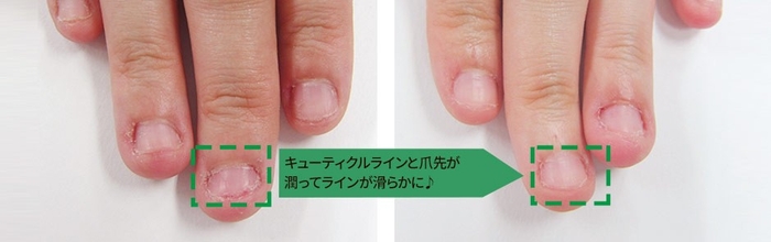 ・爪の根元部分、側面に塗布し、軽くマッサージするように馴染ませてください。