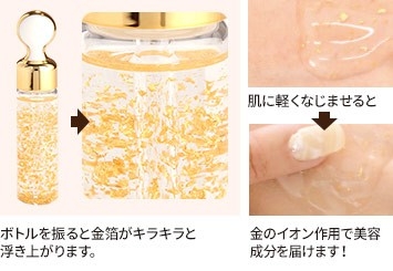 見た目にも分かるほど、金箔を贅沢に配合しました。 見た目のゴージャスさだけではなく、オイルを塗布してマッサージすると、金箔がすっと消え、微弱電流によるイオン作用が発生。 肌に美容成分を行き渡らせることでハリと弾力をキープし、イキイキとした肌へと導きます。