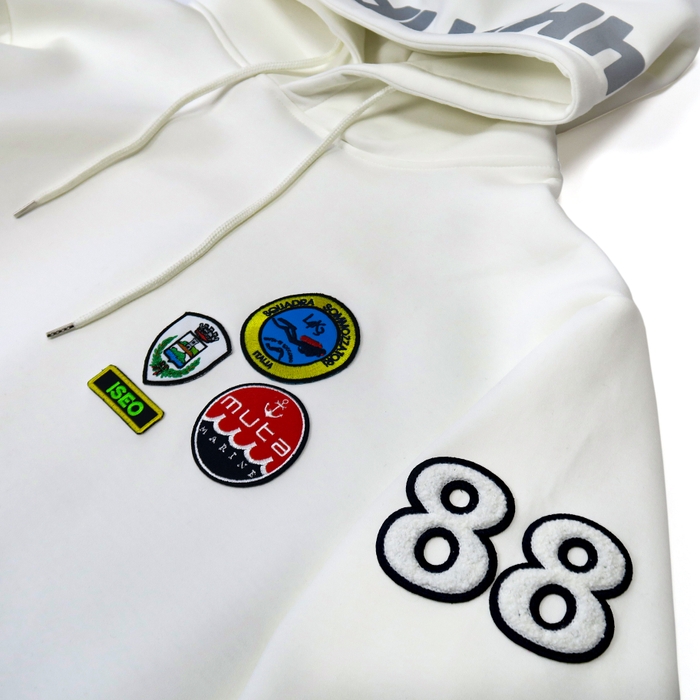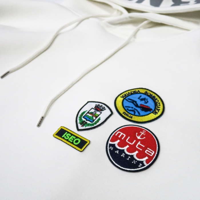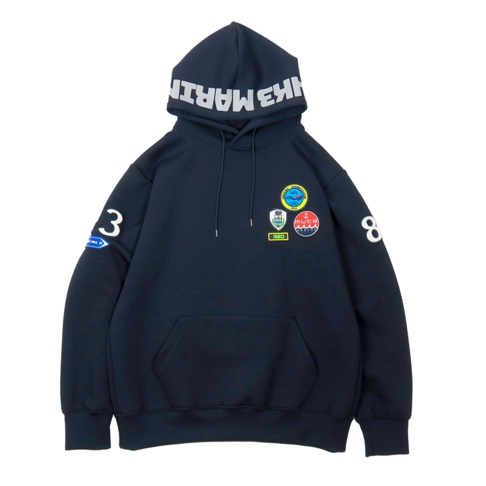 フード部分にはヨットのイラストが入ったmutaロゴがプリントされています。
