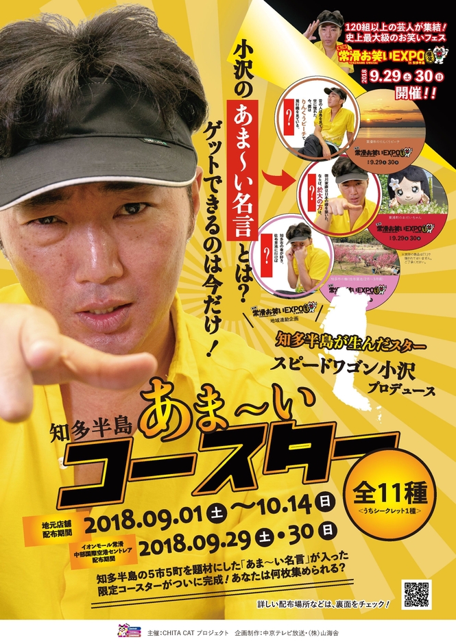 スピードワゴン小沢は愛知県知多市出身。「常滑お笑いEXPO」への参加はこれが初めてということで、ライブ出演以外に、地元レストランとのコラボ企画が決定しました。知多半島をよく知る小沢ならではの「あま~い」名言が書かれたコースターはファン必携のノベルティです。