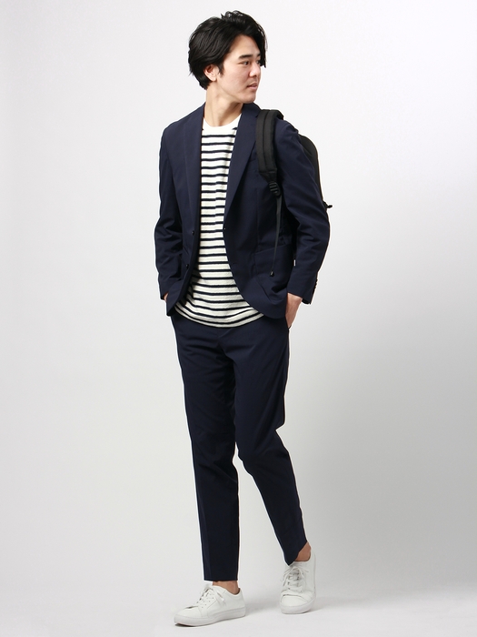 スラックスは、裾直しをせずにそのまま履けるジャスト丈と、裾裏のスナップボタンを内側に折り返すことで5㎝短いショート丈に調整ができる仕様となっています。ショート丈では、スニーカーを合わせたカジュアルスタイルとも相性が良く、コーディネートによって裾の長さを変えるなど幅広い着こなしに対応できるようにしています。またウエスト部分には、サイドゴムを採用することで、座った際の窮屈感も軽減します。