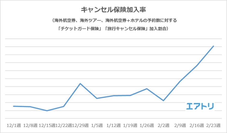 新型コロナウイルスの感染拡大に伴い、急な病気や入院で旅行をキャンセルした際にキャンセル料を補償するチケットガード保険・旅行キャンセル保険に関するお問合せも増えています。エアトリでは2月14日に1月末までの加入率についての調査結果をリリースしましたが※、2月においても引き続き加入率の上昇が見られましたので、進捗を更新し、発表します。