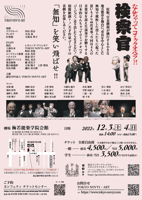 音楽家町田育弥氏に作曲を依頼し、3人の演奏家の方々をお迎えして生演奏と共にTOKYO NOVYI・ARTにしか出来ない、なんちゃってコミックオペラ⁈バージョンの「検察官」をお届け致します。