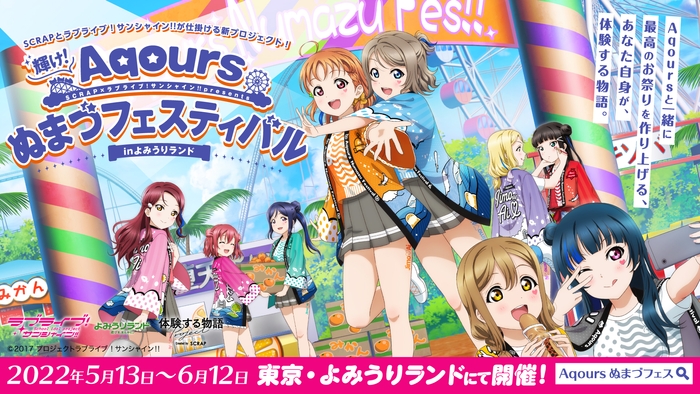 オールメディアで展開するスクールアイドルプロジェクト「ラブライブ!サンシャイン!!」は、静岡県沼津市の海辺の町、内浦にある私立浦の星女学院で結成されたスクールアイドルグループ「Aqours」の奮闘と成長を描く物語です。そんな「ラブライブ!サンシャイン!!」と、SCRAPのコラボレーションイベント『輝け!Aqoursぬまづフェスティバル in よみうりランド』は、よみうりランドに再現された「ラブライブ!サンシャイン!!」の世界の中で、参加者自身がAqoursと一緒に沼津のPRイベントを成功させることを目指す体験型イベント。
