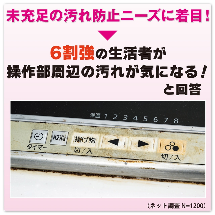 その背景に、「操作部分」は調理中に指で接触するため汚れがつきやすくなることや、凹凸のあるボタンタイプは樹脂製なので、黄ばみや劣化も発生しやすくなることがあります。さらに操作部分手前にある、調理台とコンロのスキマにも汚れが入り込みやすいという不満点があることもわかりました。これらの操作パネル部周辺の汚れに関する課題を解決する「操作パネルカバー」を発売いたしました。