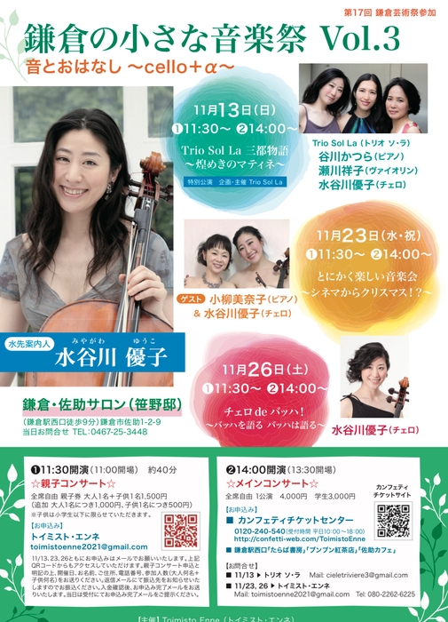 チェリスト水谷川優子による『鎌倉の小さな音楽祭』大好評につき春に続いて3回目の開催となりました!古都鎌倉の瀟洒な邸宅・隠れ家的なサロンにて国際的に活躍するアーティストたちによる楽しいトーク付きコンサート・シリーズ。
