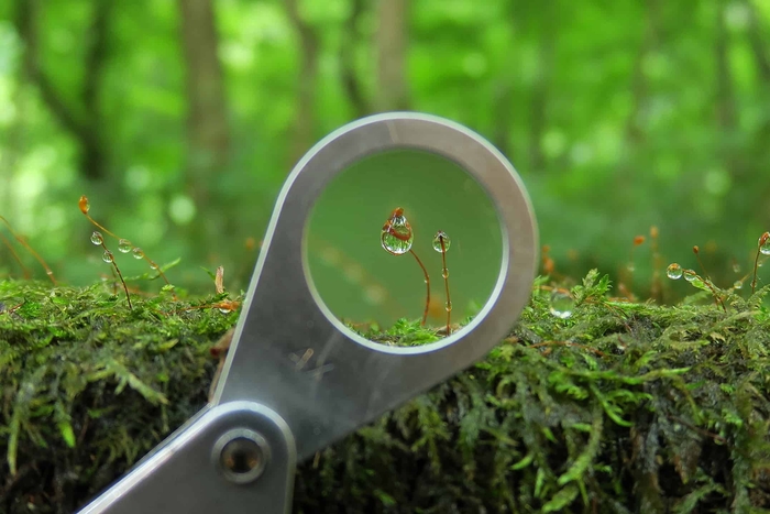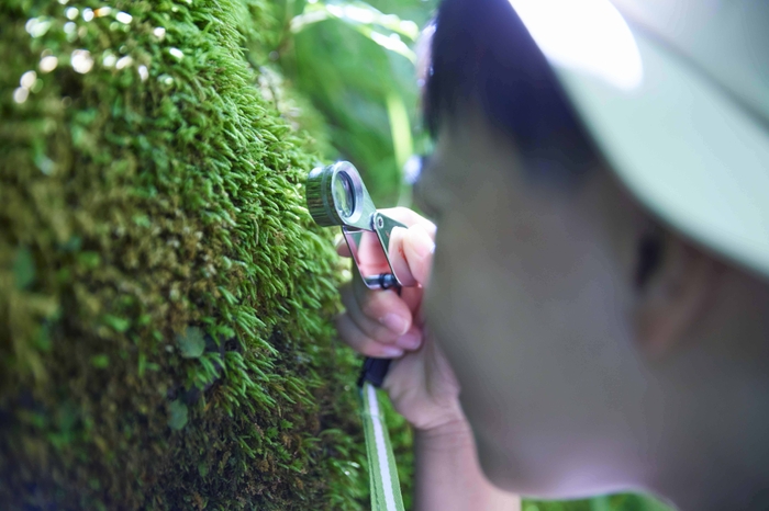 コケについて学んだあとは、ルーペを使いながら10種類のコケをすべて探し出します。日当たりや湿度などほんの少しの環境の違いで生育できる環境は異なるため、一つの岩にもさまざまなコケが生息しています。ルーペをのぞき込むと、葉っぱの細部がキラキラと輝く、肉眼ではわからない繊細な世界が広がります。コケは樹木や花などの植物を育む土台になっており、コケ観察を通して奥入瀬渓流の成り立ちや環境について、学びを深めることができます。