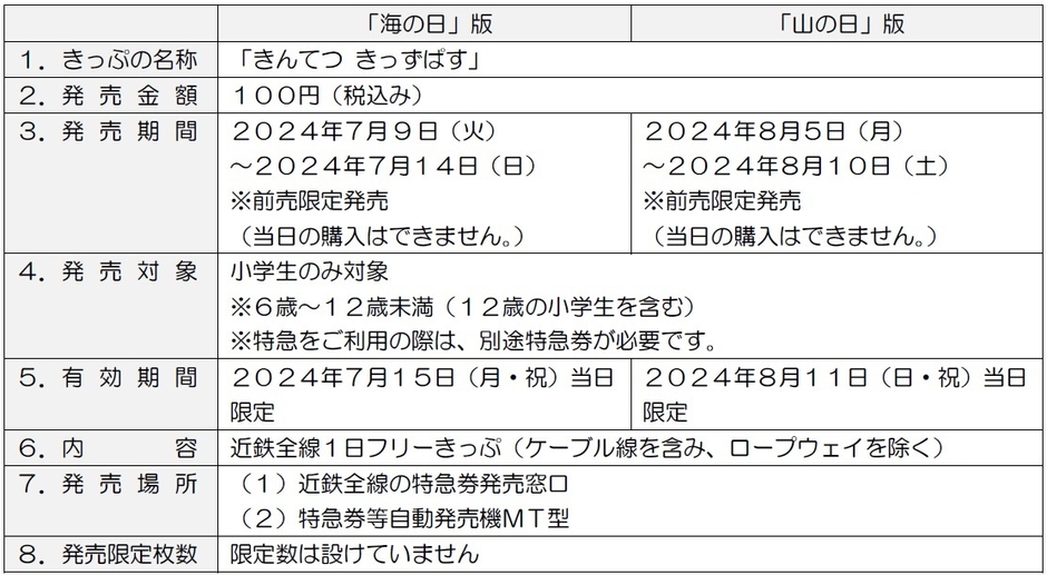 この度、2024年7月15日(月・祝)の海の日と、8月11日(日・祝)の山の日の利用限定で、小学生のお子さまを対象に近鉄全線が1日乗り放題となる「きんてつ きっずぱす」を100円で発売します。