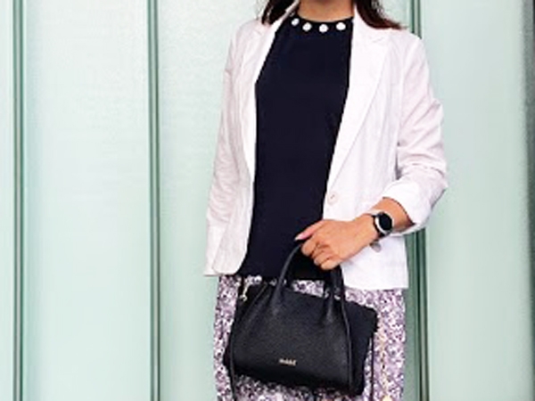 オフィスシーンでは華やかなパールのアクセントのプリントが、ランニングシーンではリフレクターとなり車からの視認性を高めます。