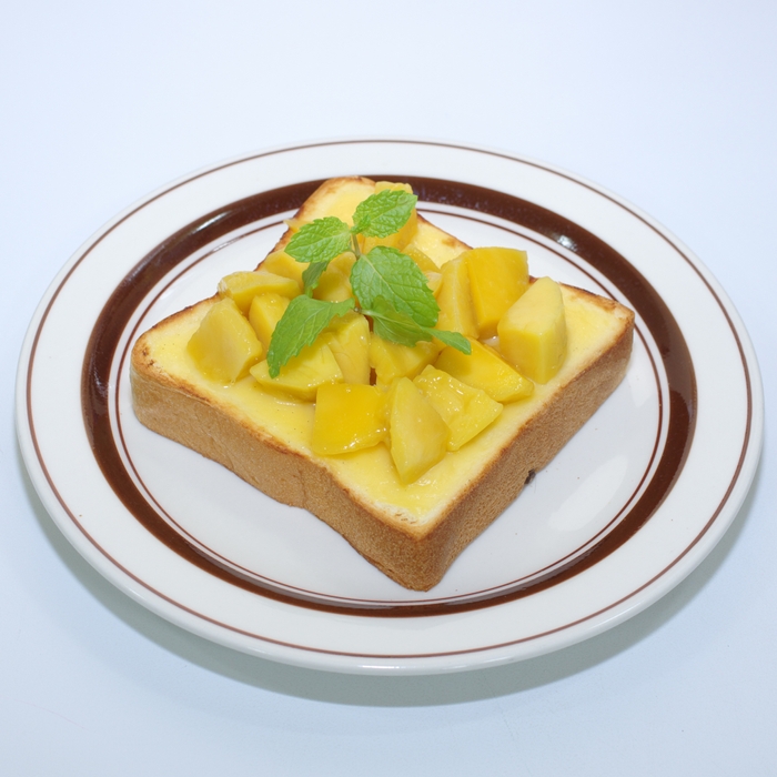 アツアツの甘いカスタードクリームトーストの上に、香り豊かなマンゴーをたっぷりトッピングしました。