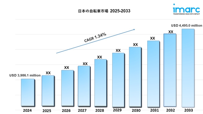 IMARCグループの最新レポートによると、日本の自転車市場規模は2024年に39億8,610万米ドルに達しました。今後、IMARCグループは、2025年から2033年の間に年平均成長率(CAGR)1.34%で成長し、2033年までに市場が44億9,500万米ドルに達すると予想しています。