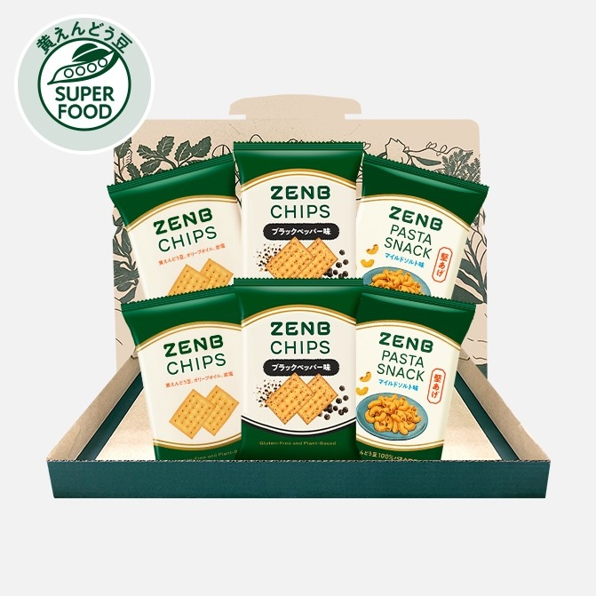 ・内訳:ZENBチップス2種(プレーン、ブラックペッパー味)×各2袋+ZENBパスタスナック×2袋