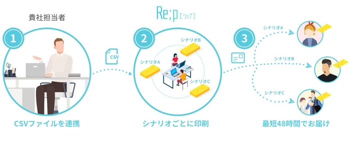 「Re;p」は最短48時間でお客様のお手元にパーソナライズDM送付できるソリューションです。10,000通送付であれば10,000通りのクリエイティブを刷り分け、データ連携も手軽なことからメールと同様にDMアプローチを可能にします。さらにRe;pは導入して終わりのツールではなく、ダイレクトマーケティング15年以上・1,000社以上の支援実績を持つファインドスターが施策の成功までのご支援も行う新しいマーケティングソリューションです。