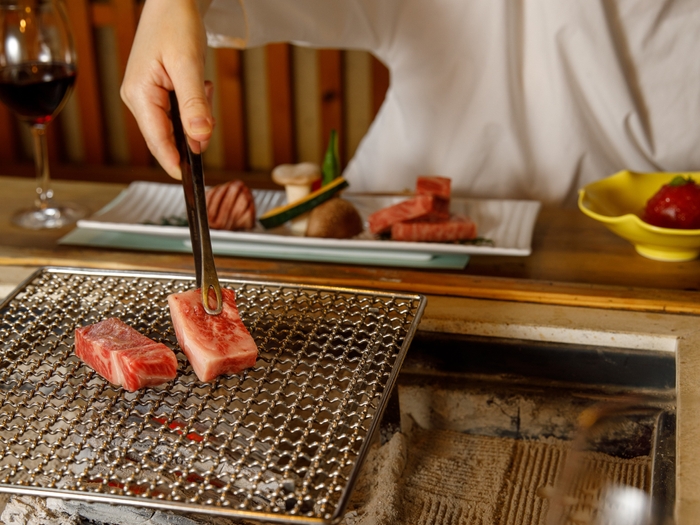 ◆コースのお食事では、仙台味噌焼きおにぎりを炭火の網の上に置いて、大葉に少し焦げ目がついたら、お好みで仙台牛しぐれ煮とわさびを添え、お出汁をかけてお召し上がりください